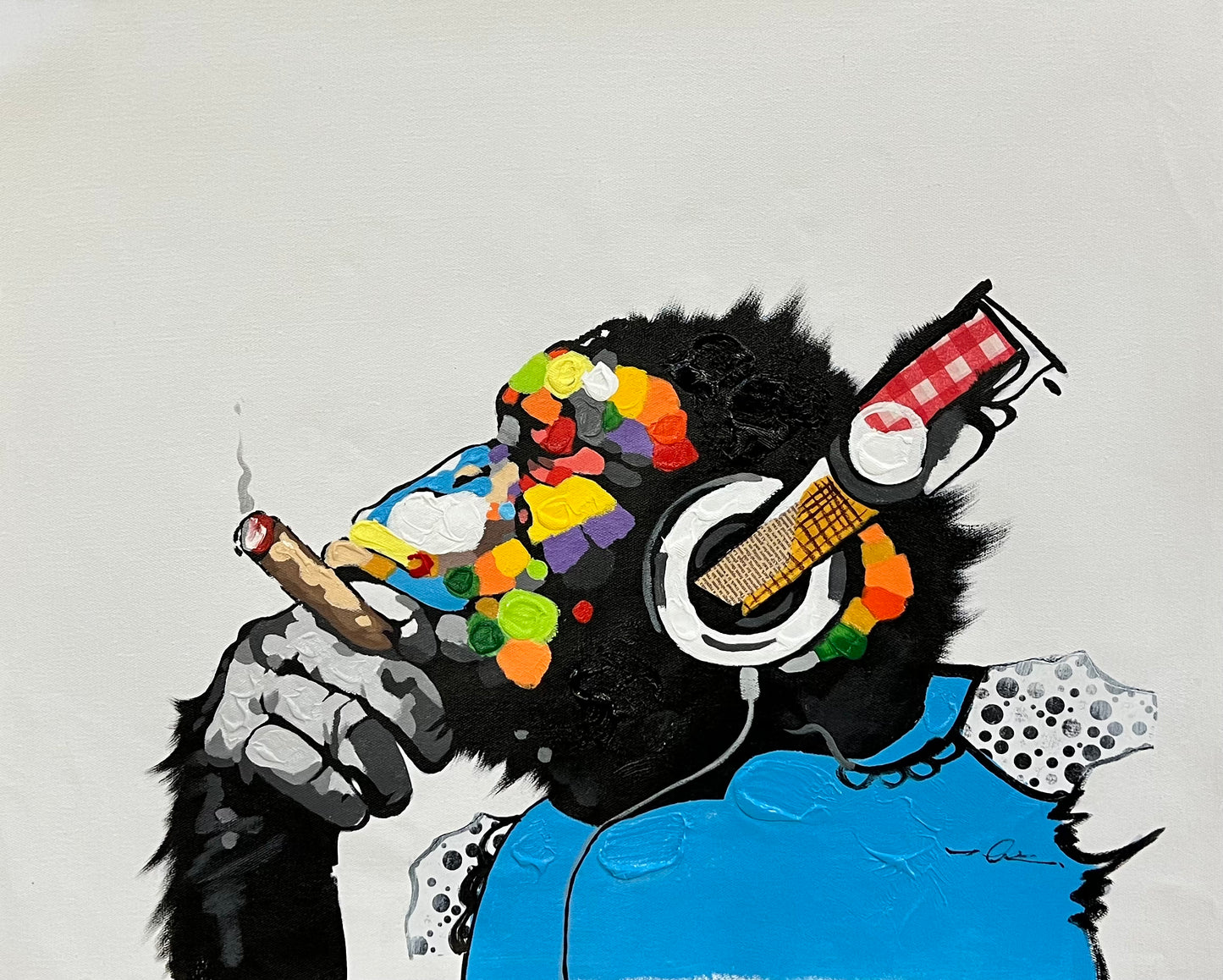 Beats flippin' awesome! This wild oil painting features a monkey with headphones, puffing on a big cigar - the perfect combination of chill vibes and cool tunes!