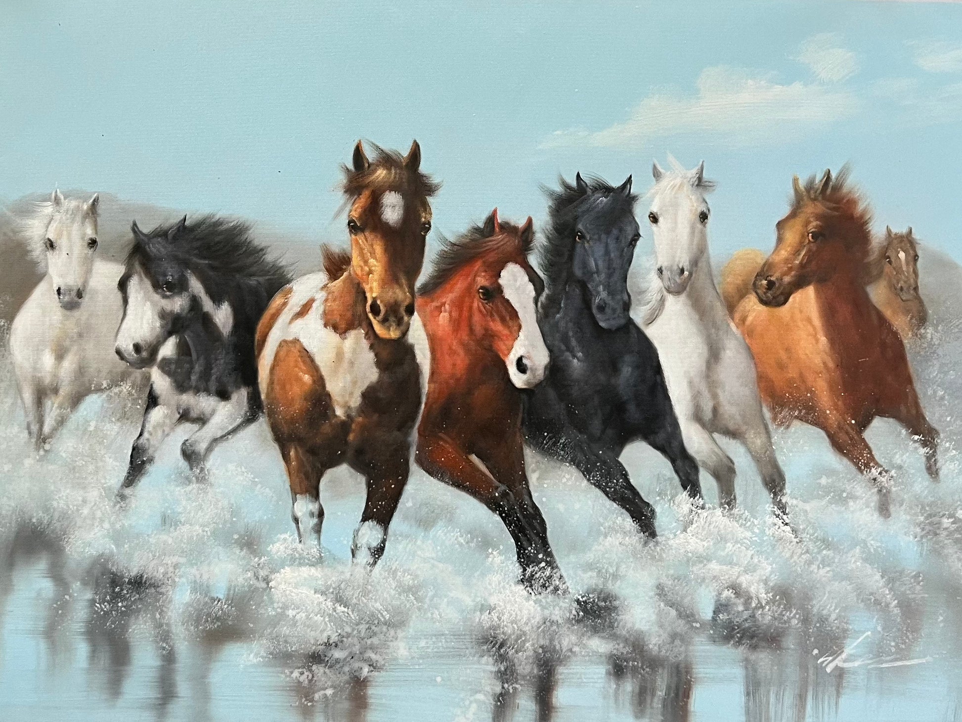 This intricate oil painting of eight horses running through the water, entitled "Horse Stampede," is a perfect addition to any home, office, or studio. The high-quality artistry combines bold, vivid colors with precise detail to create a captivating scene that will draw the eye and provide an interesting conversation piece.