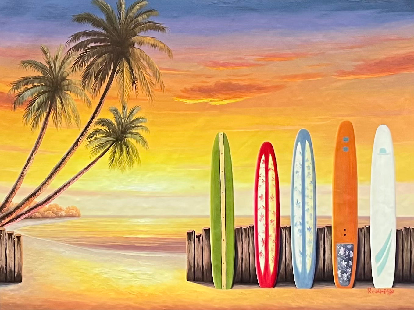 Adorn your walls with the vibrant beauty of Surfboards Sunset, an oil painting depicting colorful surfboards set against a bright, majestic sunset. Let its poise and refinement grace your space and enjoy the grace that this eye-catching work of art brings.