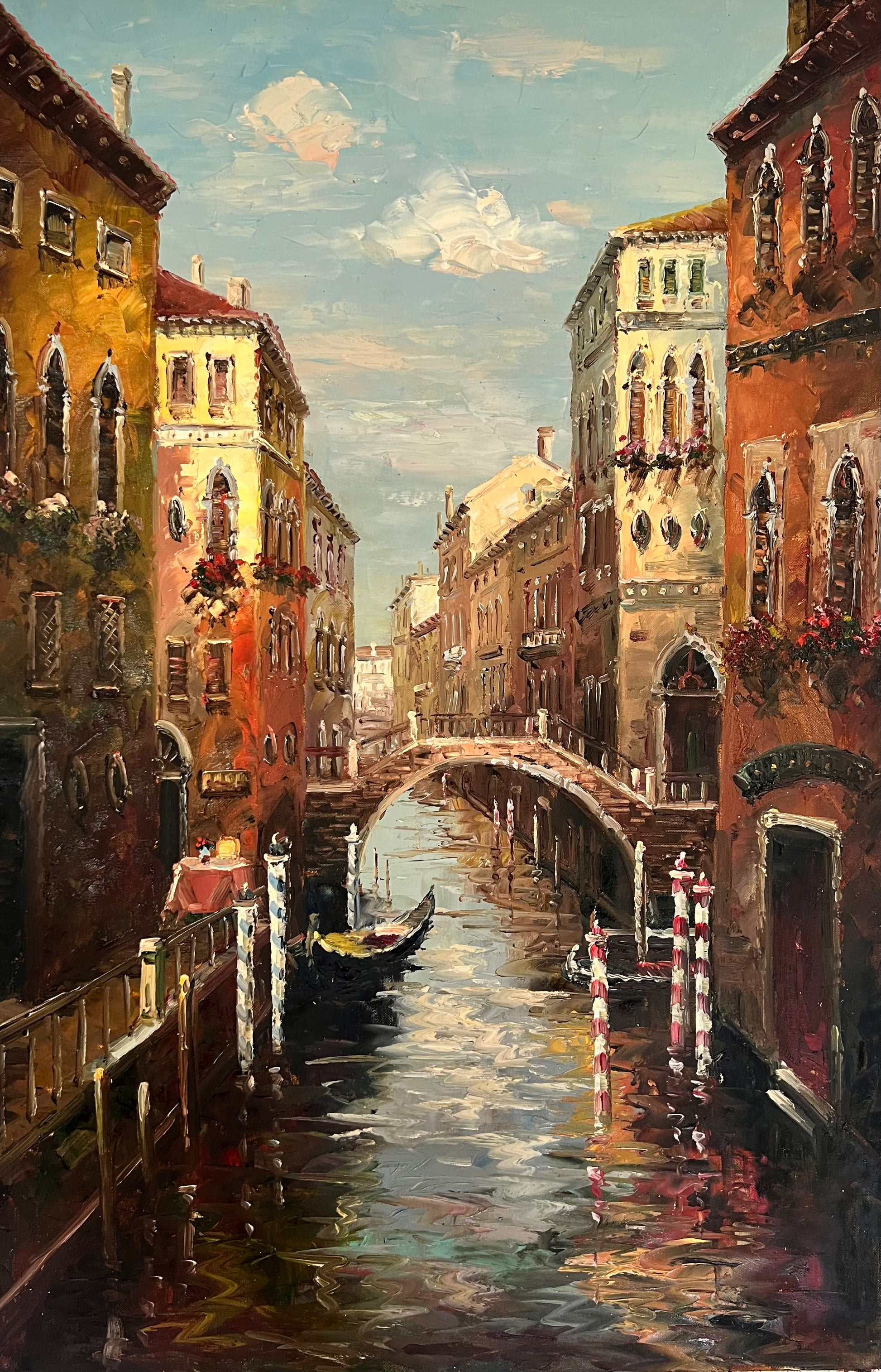 Introducing the sophisticated Venice Canal oil painting, capturing the dark and mysterious tone of the iconic city. With intricate brushstrokes, this piece brings a touch of luxury to any space. Elevate your collection with this exclusive work of art inspired by the magical world of Venice.
